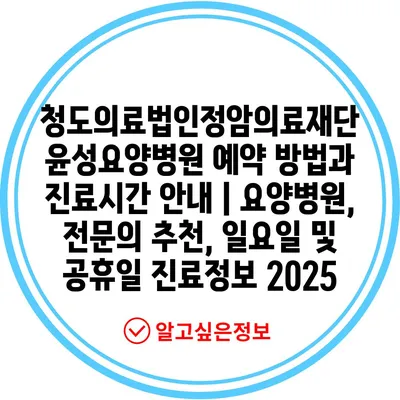 청도의료법인정암의료재단 윤성요양병원 예약 방법과 진료시간 공지 | 요양병원, 전연락 추천, 일요일 및 공휴일 진료정보 2025 에 대해 자주 묻는 질문 TOP 5