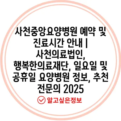 사천중앙요양병원 예약 및 진료시간 공지 | 사천의료법인, 행복한의료재단, 일요일 및 공휴일 요양병원 정보, 추천 전연락 2025