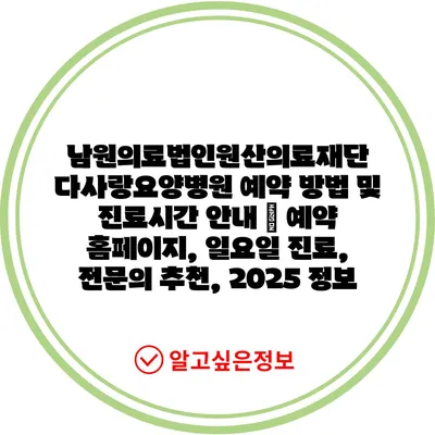 남원의료법인원산의료재단 다사랑요양병원 예약 방법 및 진료시간 공지 | 예약 홈페이지, 일요일 진료, 전연락 추천, 2025 정보 에 대해 자주 묻는 질문 TOP 5