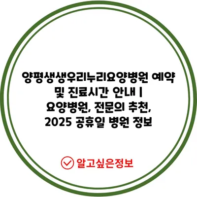 양평생생우리누리요양병원 예약 및 진료시간 공지 | 요양병원, 전연락 추천, 2025 공휴일 병원 정보 에 대해 자주 묻는 질문 TOP 5
